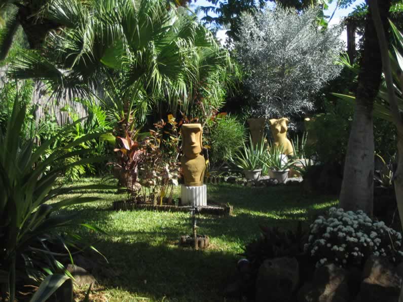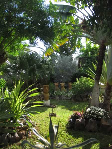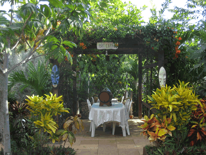 Un petit jardin botanique est aménagé en zone sèche, agrémenté de plantes adaptées (cactus et plantes médicinales) et de poteries.