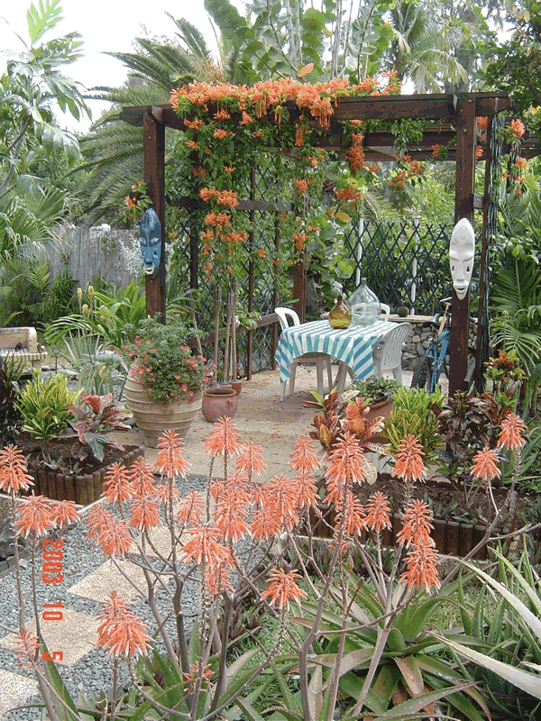 La pergola à l'abri des lianes aurore et des Aloès en fleurs.